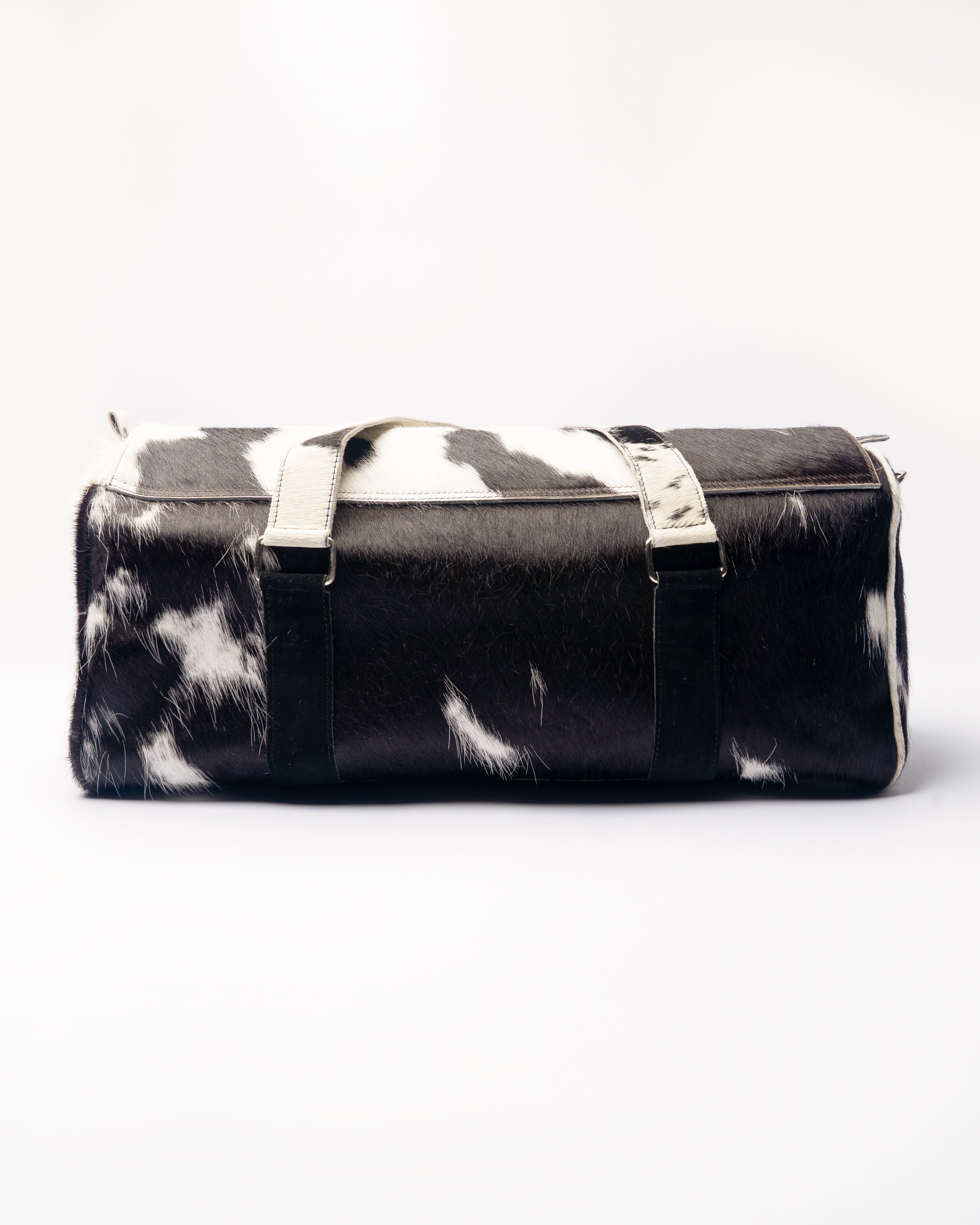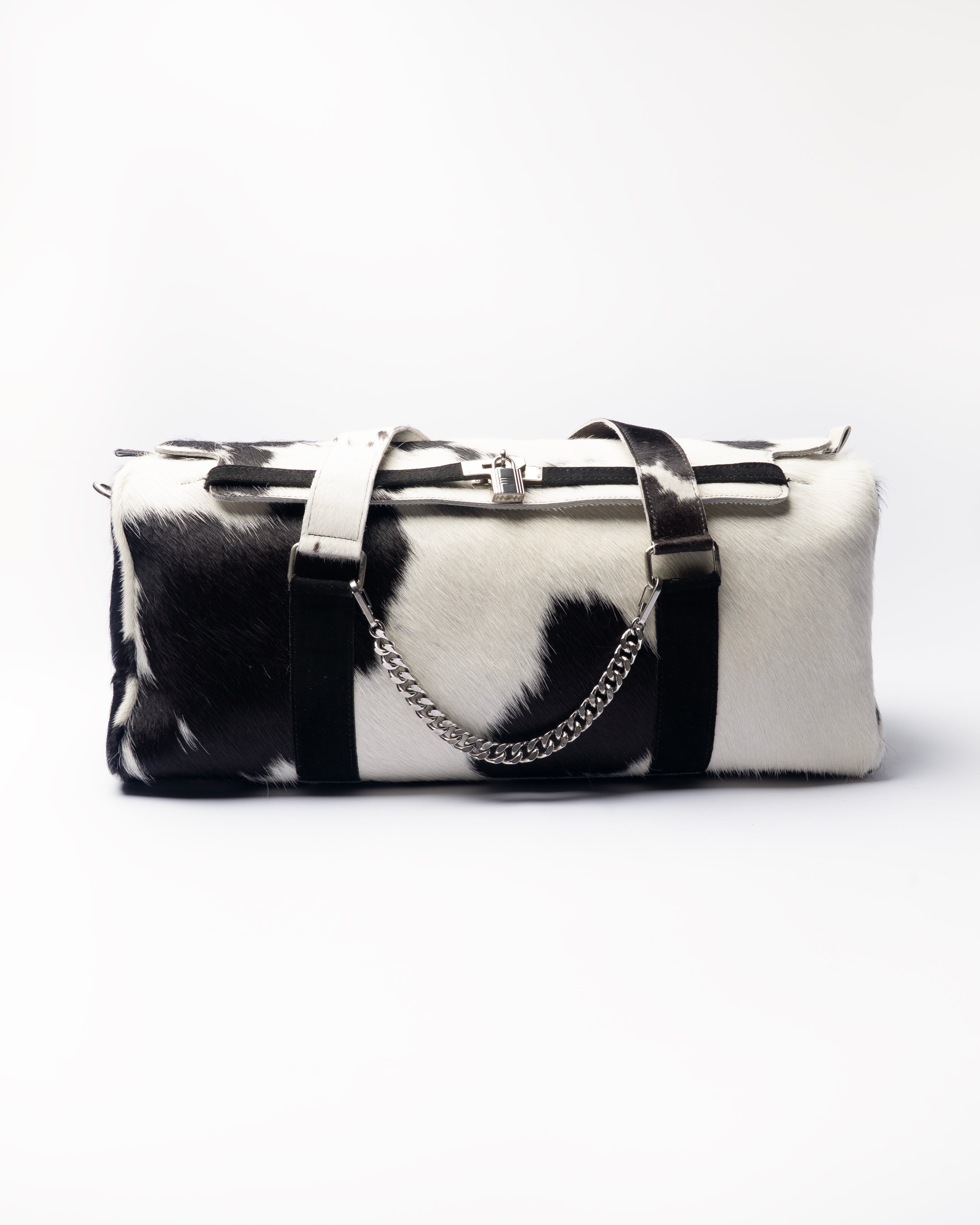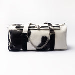 This black & white cowhide duffle isn’t just a bag, it’s a statement. Paired with a stainless steel chain you can clip, swap, or remove depending on your vibe.