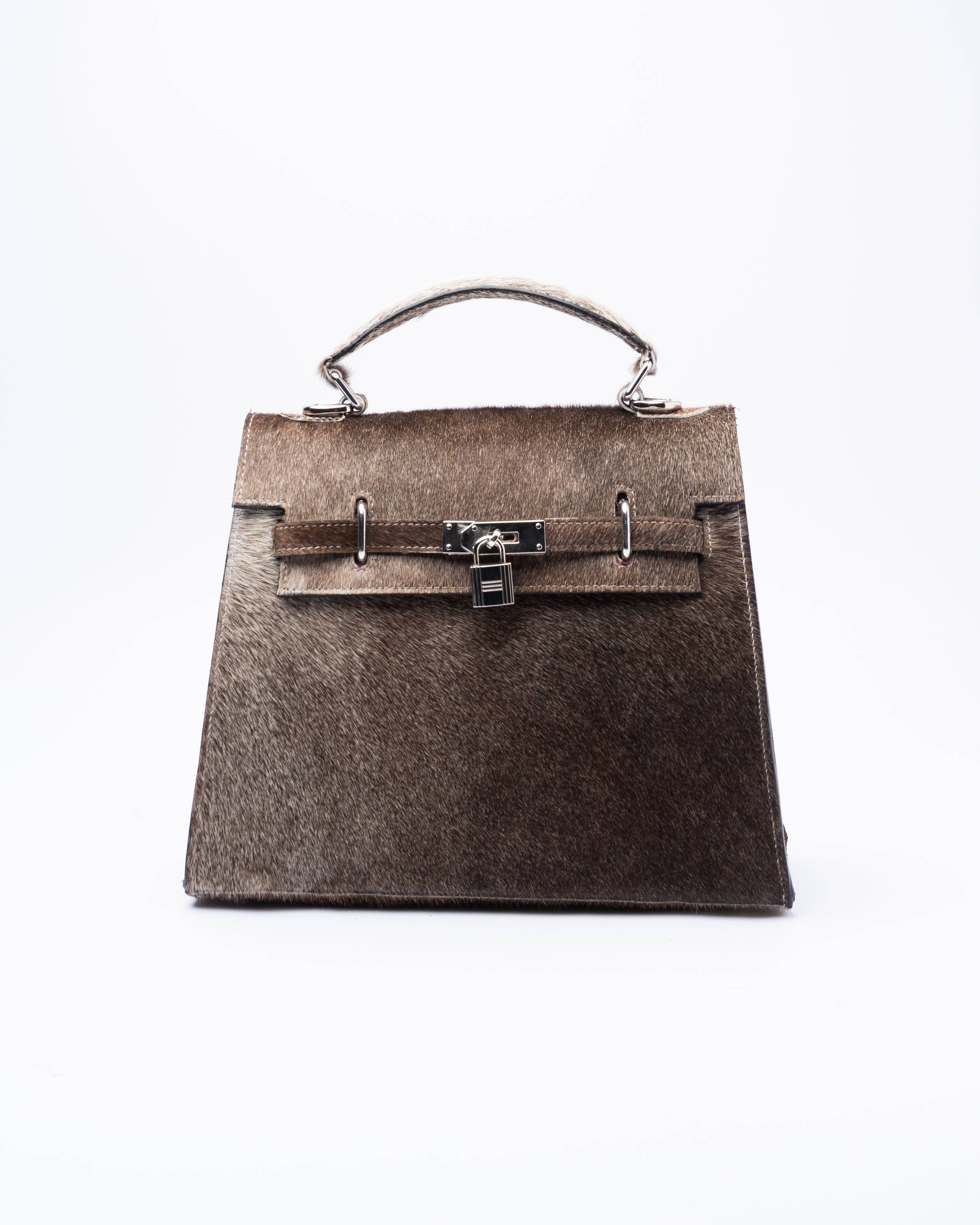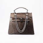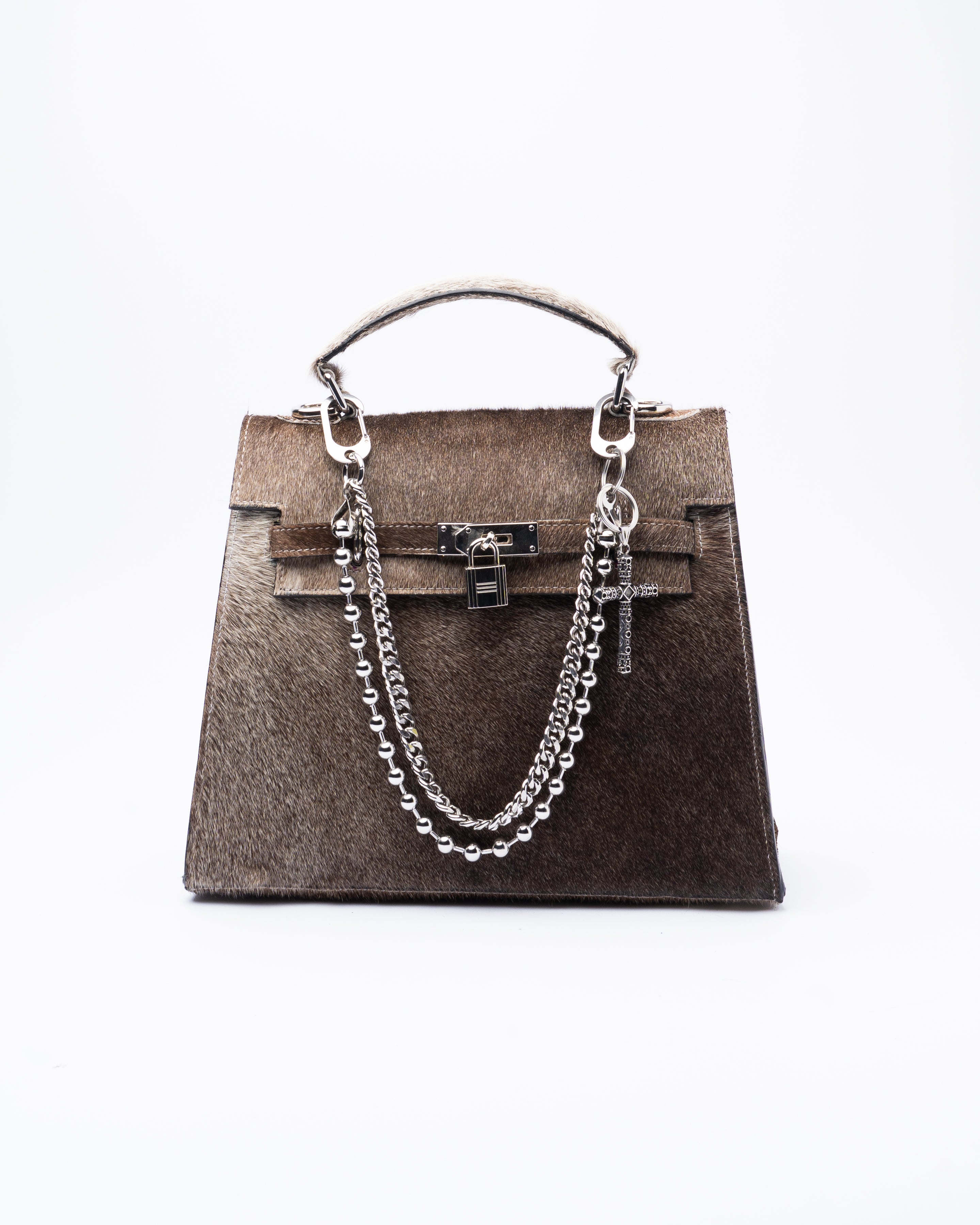 This dusty brown cowhide handbag takes the iconic structured silhouette and gives it an unapologetic edge. Crafted from authentic cowhide, each piece carries its own unique pattern. Pairs perfectly with our handcrafted stainless steel chain charm and made to be styled your way.