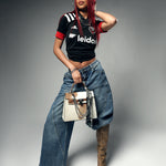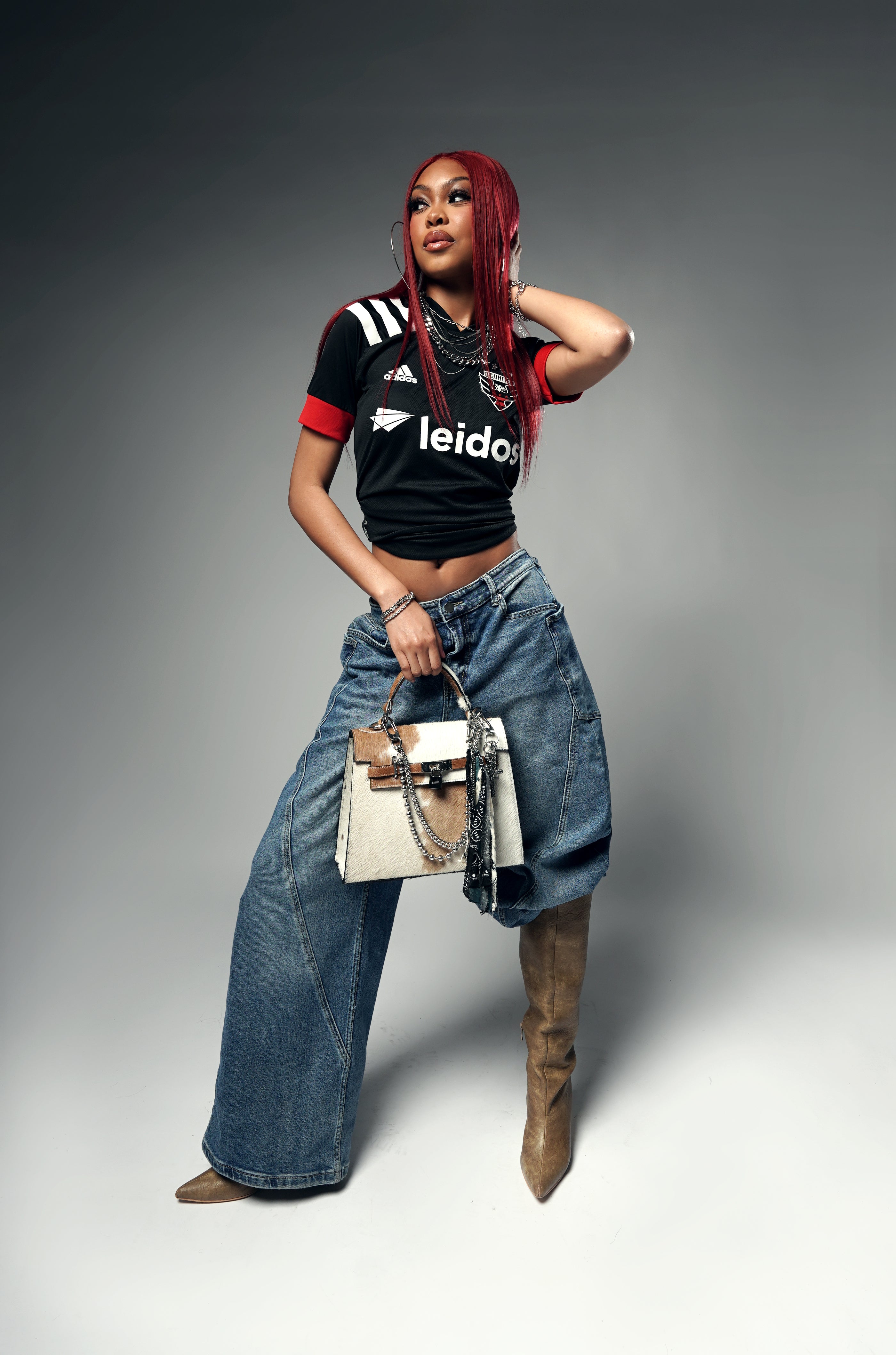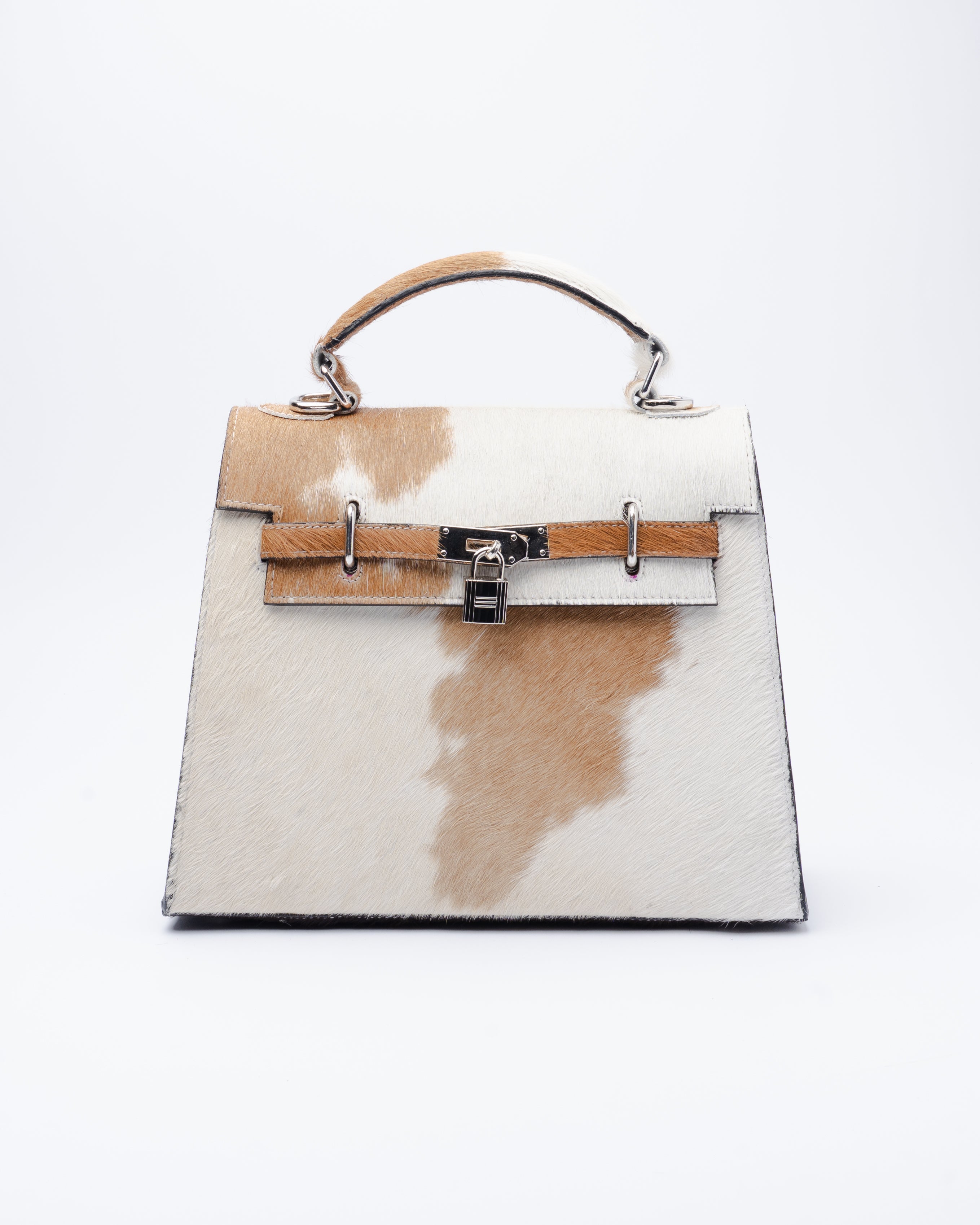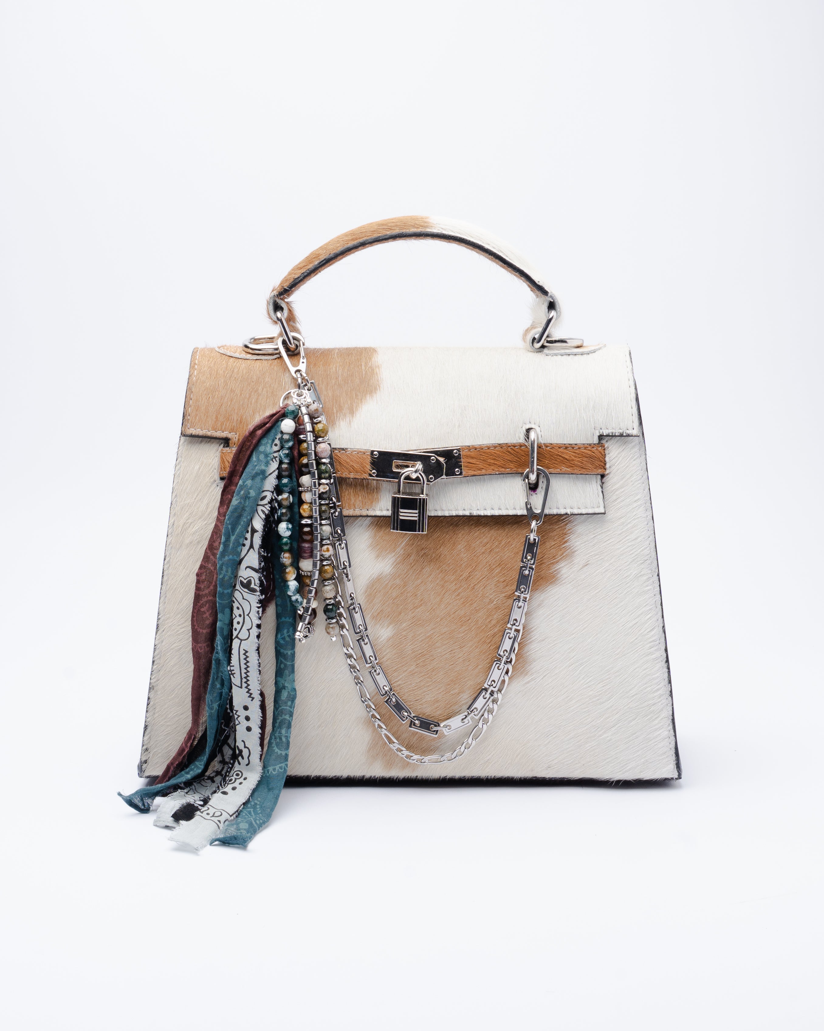 Authentic brown & white cowhide bag with a timeless structured silhouette. Shown with Rooted Chain.