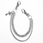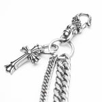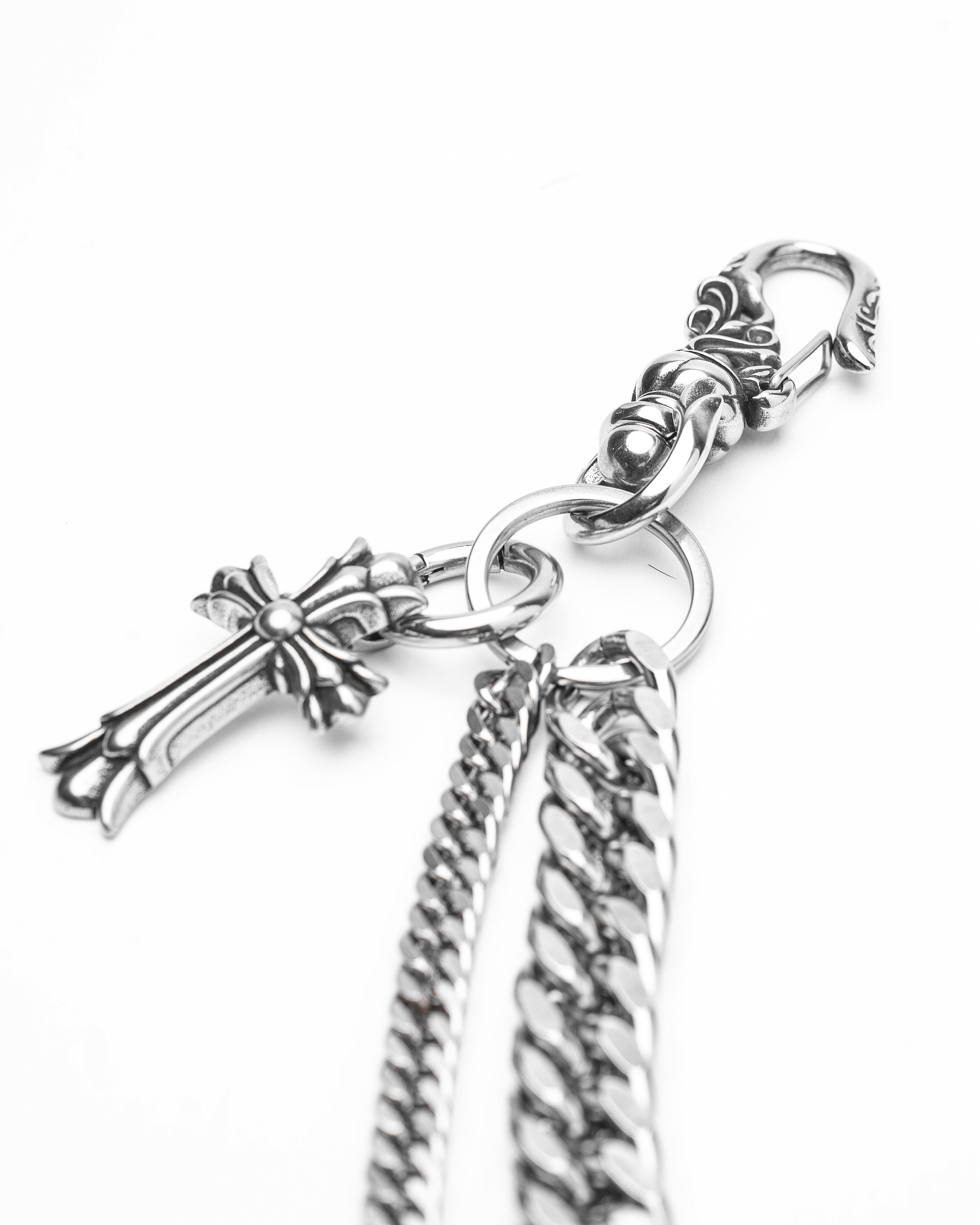 Layered stainless steel bag chain with cross pendant.